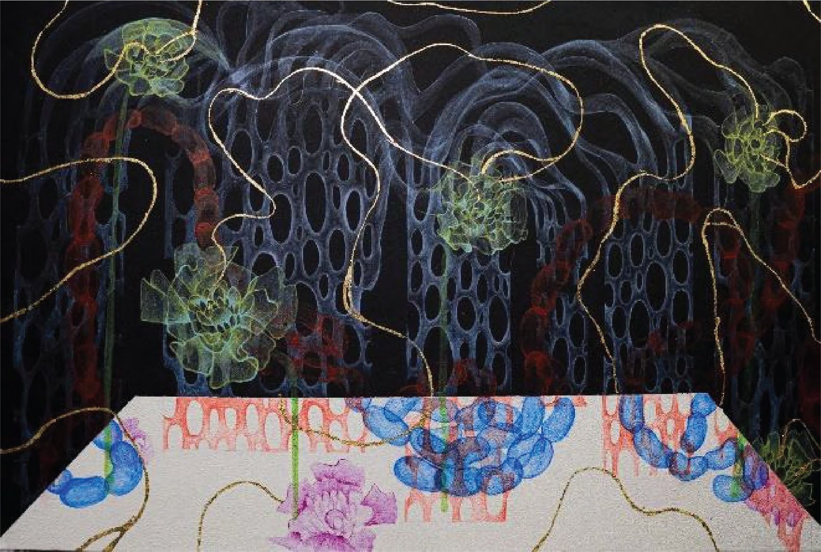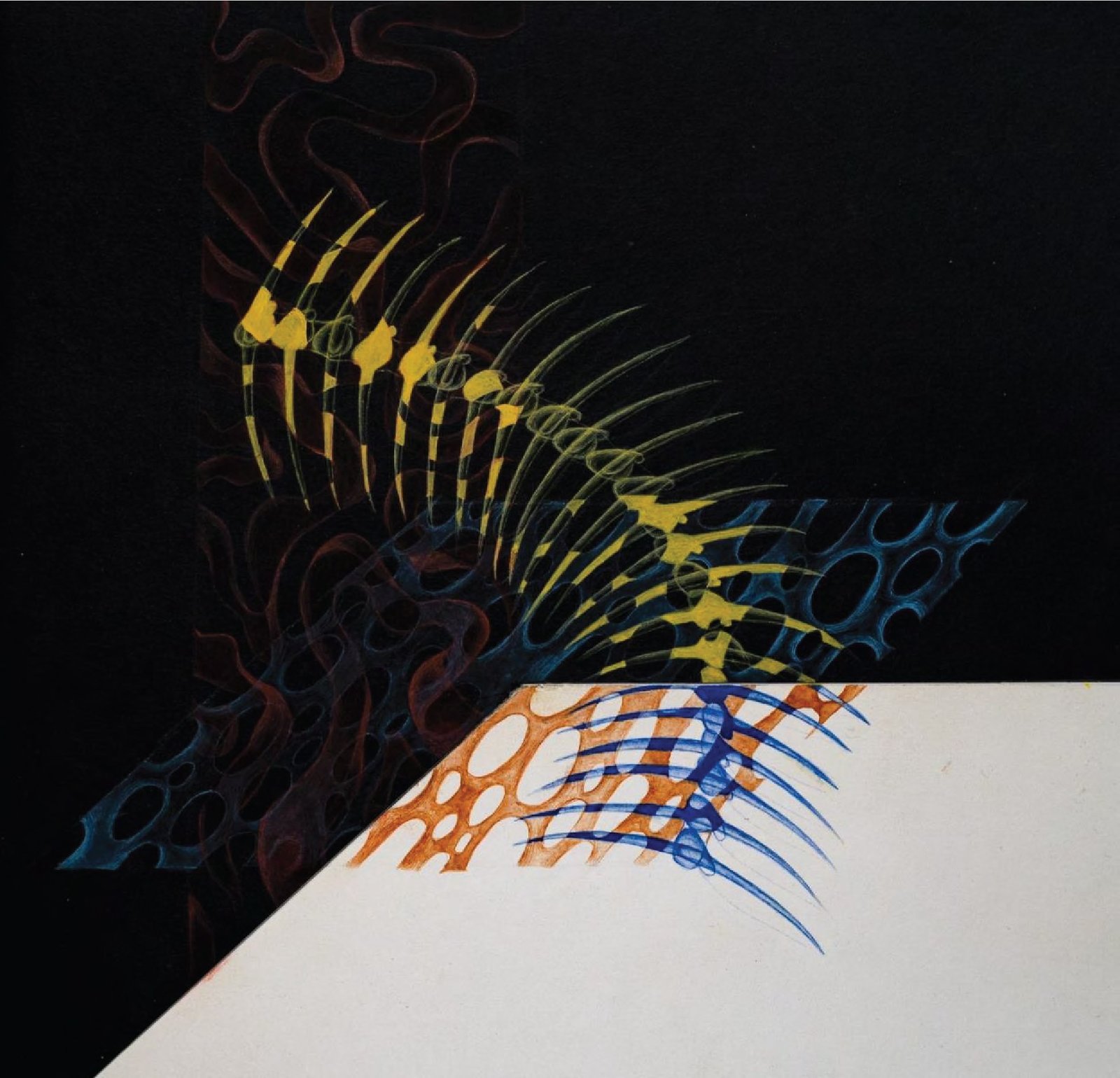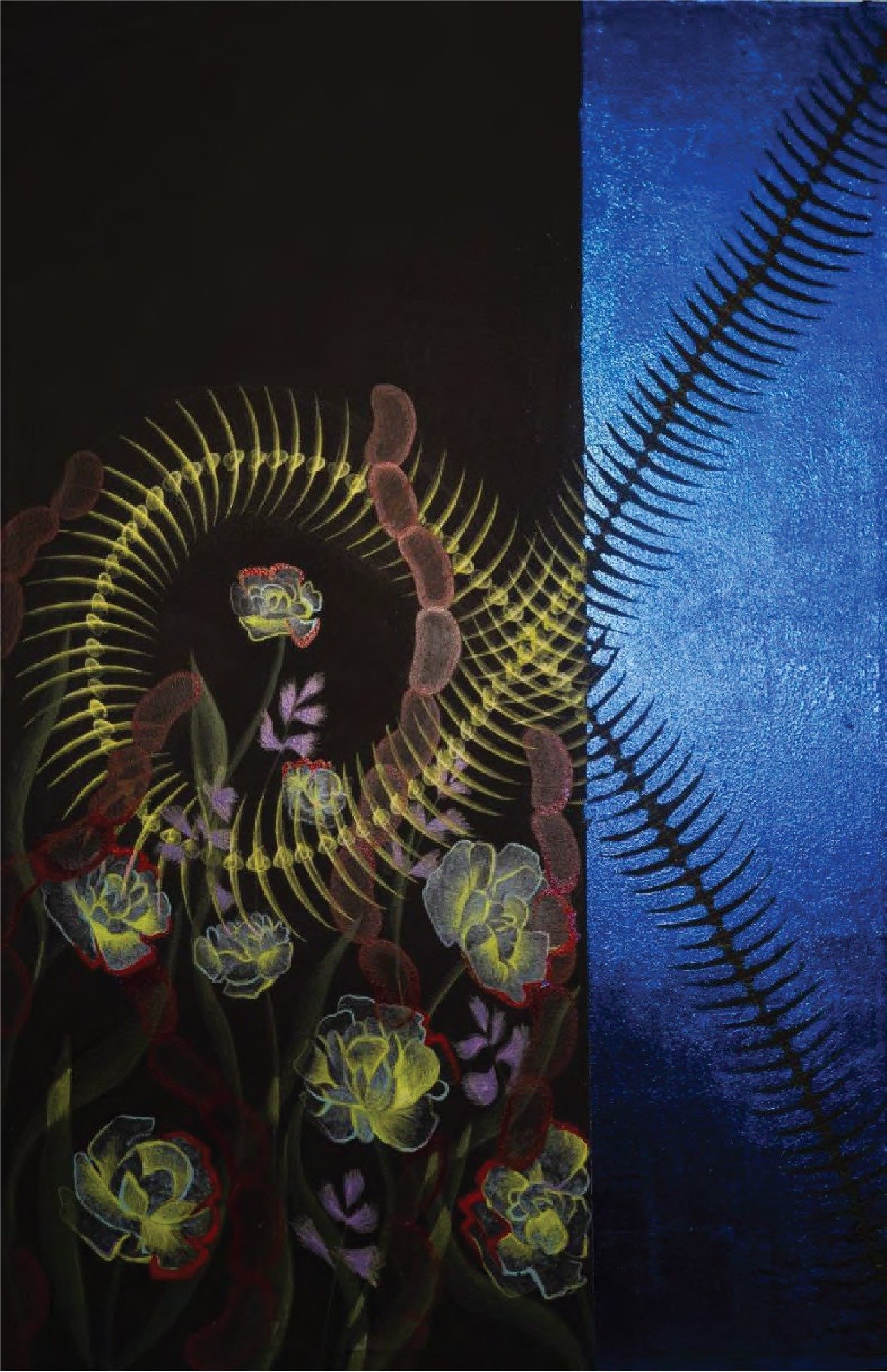 Whether it’s the jagged line of a fish spine evoking destruction, or carnations blooming as flesh made of creation, whether transparent forms or