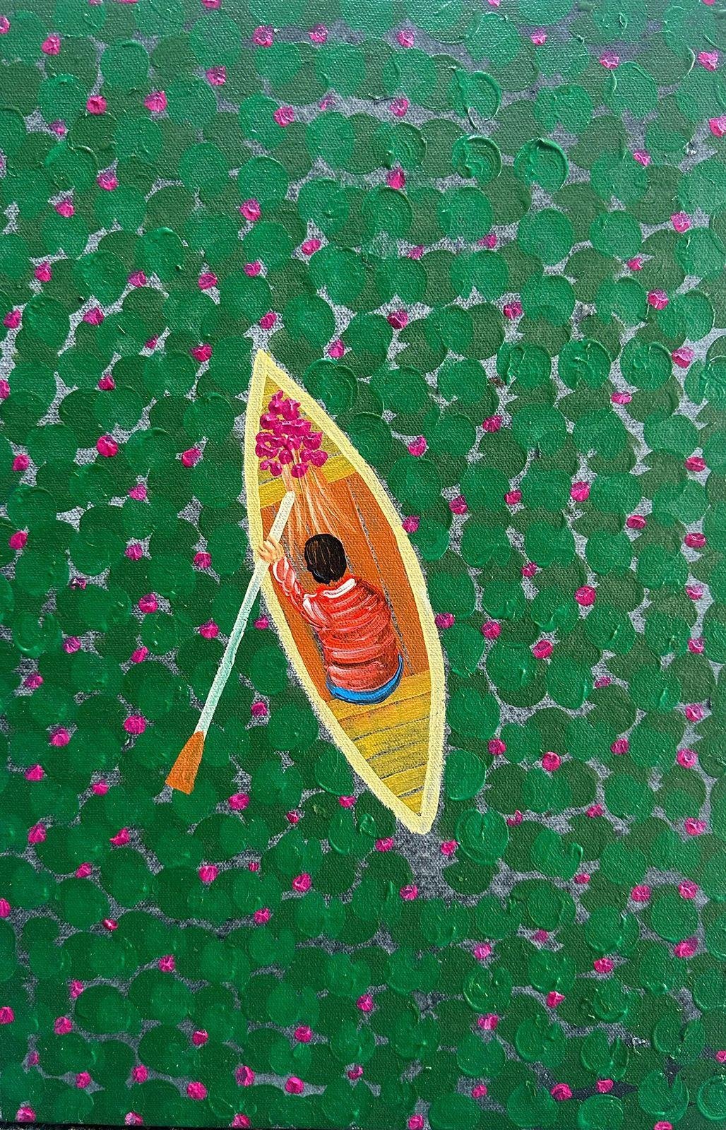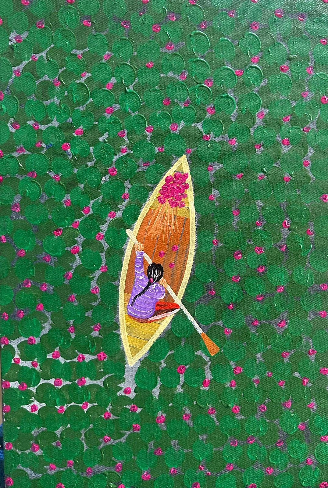 The central theme of my paintings is often inspired by nature, especially lily pods and boats. Through colors and textures, I express calmness, movement, and emotions on my canvas. Each painting reflects my personal story and observations.