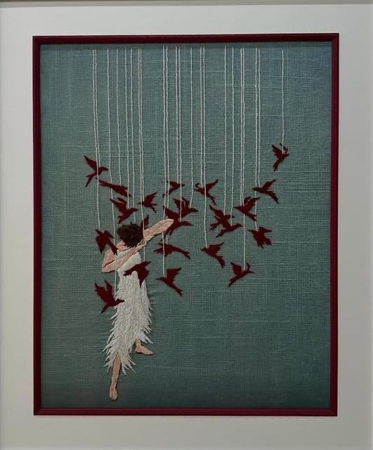 This evocative artwork by Hifza Usman captures a delicate moment of emotional release and transformation. A solitary figure, suspended in motion, reaches outward as a flock of deep red birds emerges—symbolizing freedom, longing, and the breaking of inner constraints. The muted background contrasts beautifully with the vibrant birds, drawing attention to the interplay between stillness and movement. Through texture and composition, the artist conveys a poetic narrative of escape, self-discovery, and the quiet strength found in letting go.