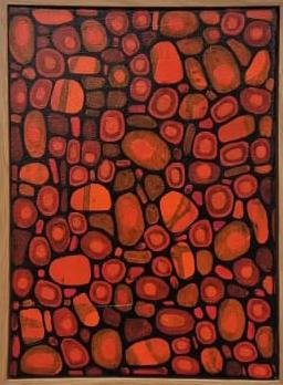 This striking abstract composition by Yasmeen explores rhythm and repetition through a mosaic of organic forms. The clustered shapes, outlined in bold dark lines, resemble natural elements such as stones or cells, creating a sense of depth and interconnectedness. Warm tones of red, orange, and earthy browns dominate the palette, evoking energy, warmth, and vitality. The balanced arrangement and textured variations reflect harmony within chaos, inviting the viewer to contemplate patterns found in both nature and human experience.
