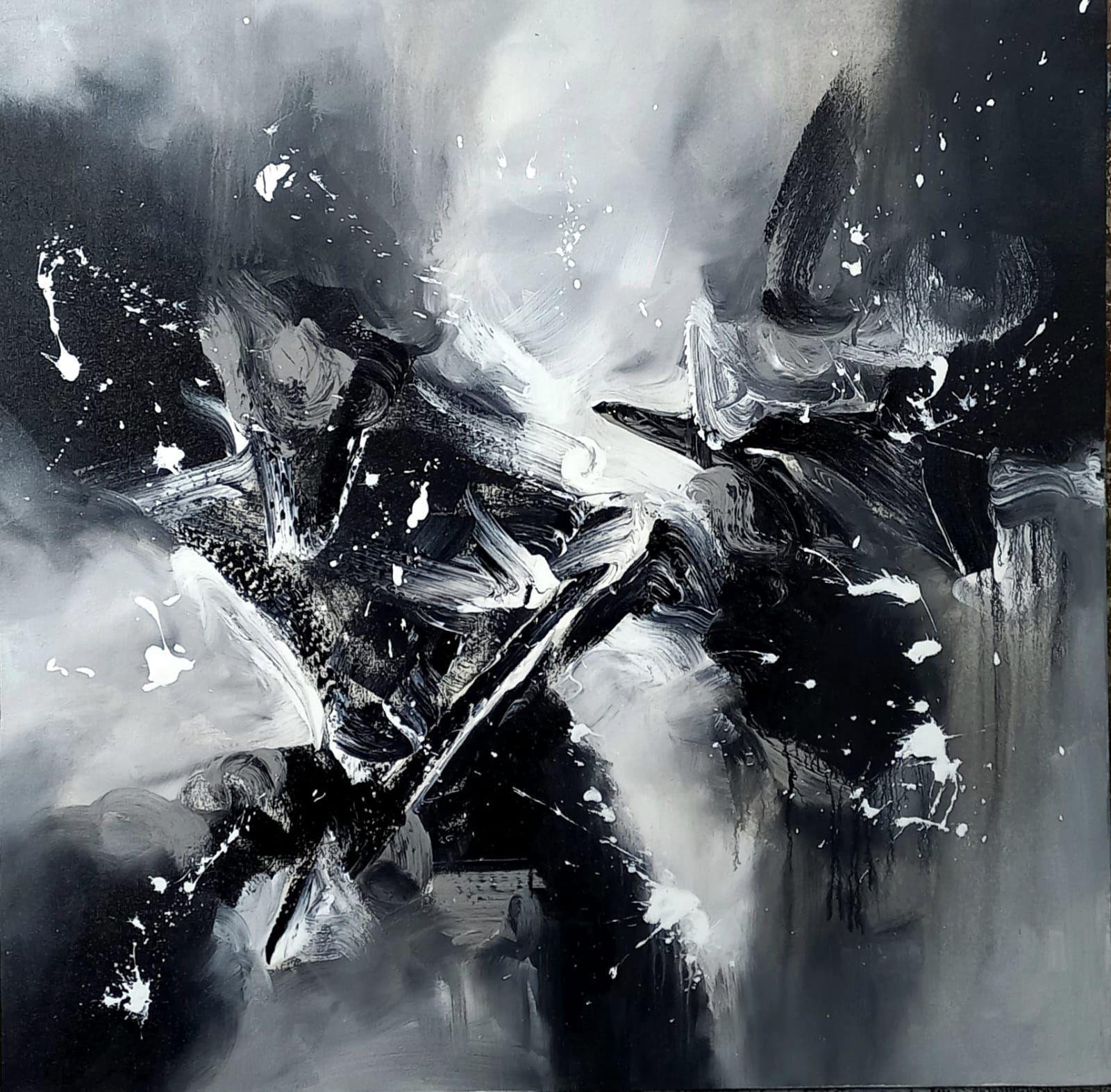 This abstract composition explores the dynamic interplay of light and shadow through bold monochromatic tones. The expressive brushwork and layered textures evoke movement and emotion, inviting viewers to interpret their own narrative within the chaos and calm. A striking contemporary piece that adds depth and sophistication to any space.
