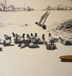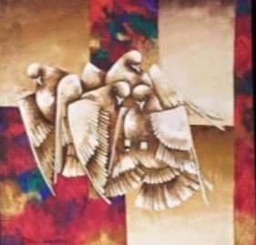 This artwork is by Irfan Ahmed, a Pakistani artist known for his realistic oil paintings, especially featuring pigeons, animals, and everyday life scenes. The painting shows a group of pigeons gathered on the ground, with one pigeon captured in motion as it flies above the others, creating a dynamic and lively composition. The use of soft, muted tones and a slightly blurred background gives the artwork a calm and nostalgic feel, while the focus on the birds adds movement and depth. Irfan Ahmed often works with oil on canvas and creates detailed, lifelike compositions that reflect urban environments and simple moments of life. His pigeon-themed artworks are quite popular and are commonly displayed in galleries, showing his skill in realism and observation of nature